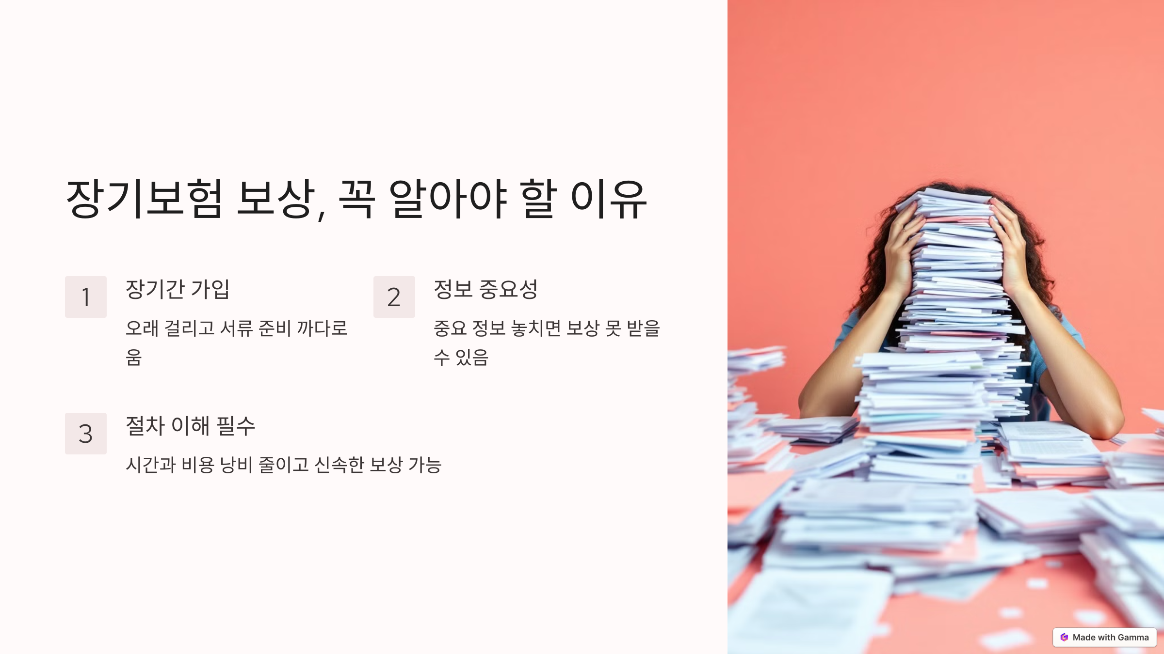 장기보험은 자동차보험이나 실손보험과는 다르게 장기간 동안 가입하고 보장받는 상품입니다. 따라서 보상 절차 역시 오래 걸릴 수 있고 서류 준비가 까다로울 수 있어요. 보험사와의 소통 과정에서 중요한 정보를 놓치면 보상받지 못하거나 금액이 줄어드는 경우도 발생할 수 있습니다.