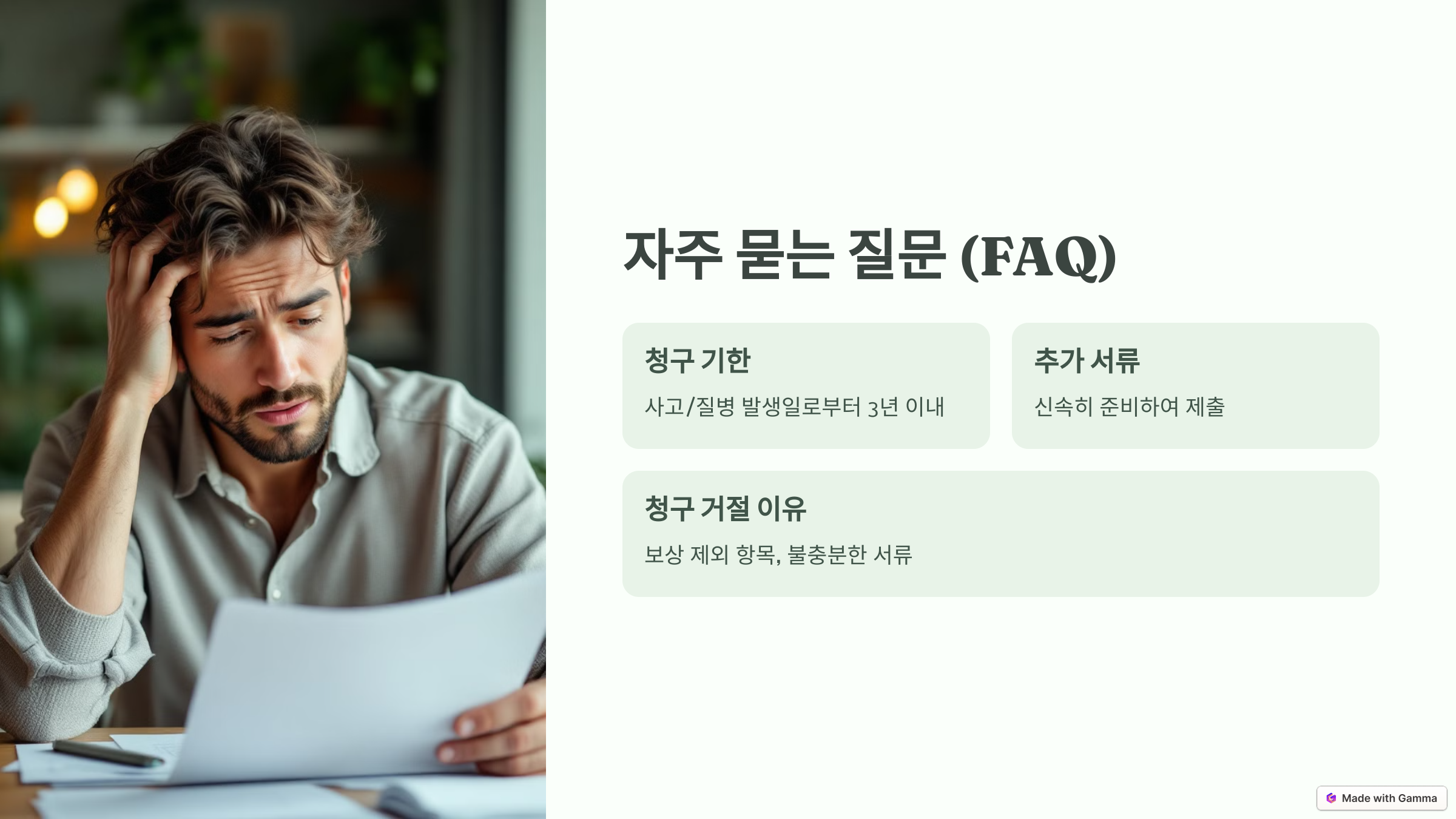A3. 보험 약관에서 보상 제외 항목에 해당하거나, 제출한 서류가 불충분한 경우 거절될 수 있습니다. 제출 전 약관과 요구 서류를 꼼꼼히 확인하세요.