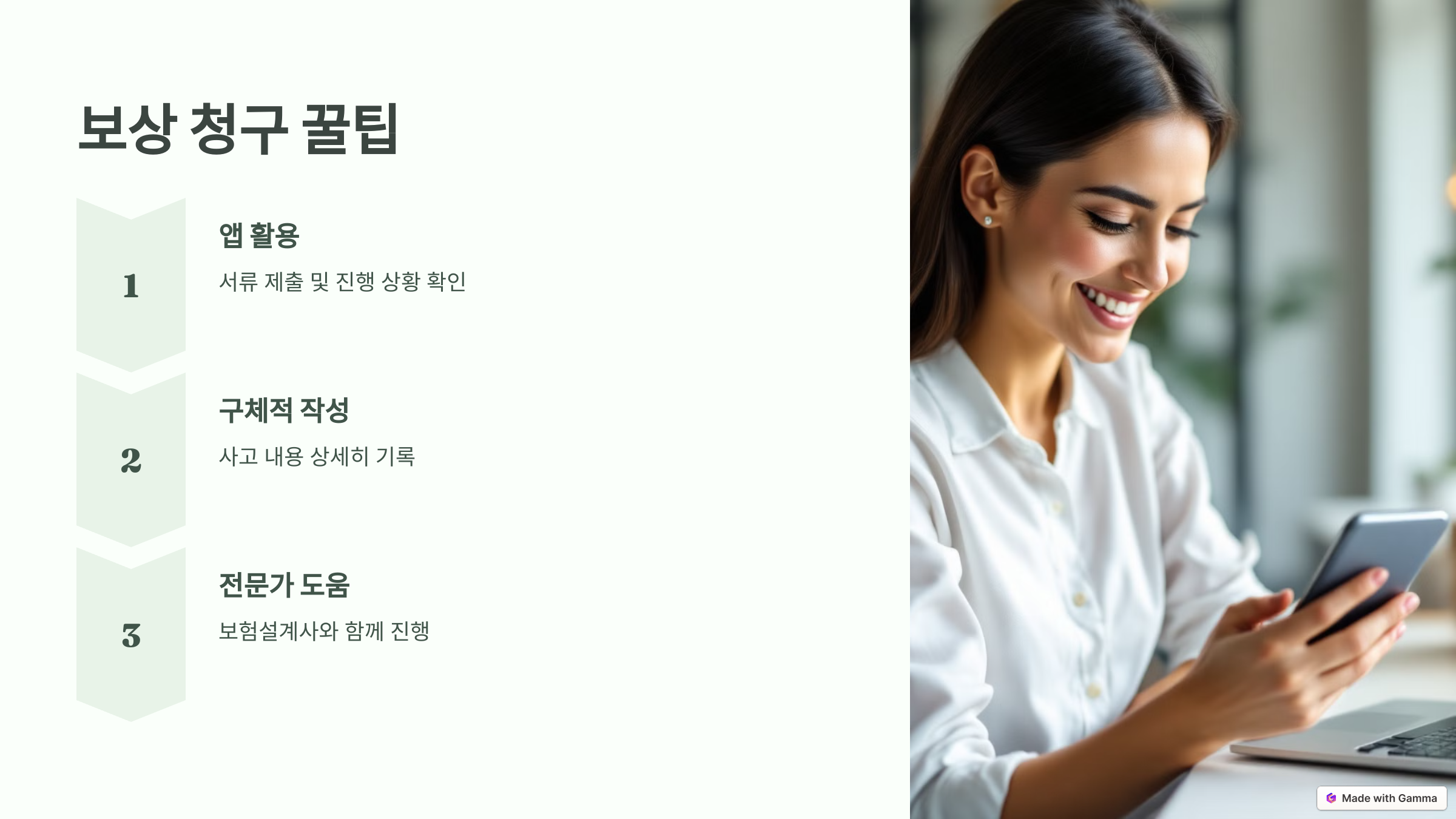 보험사에 사고 내용을 전달할 때 구체적이고 사실적으로 작성하세요. 모호한 설명은 심사 과정에서 불리하게 작용할 수 있습니다.
