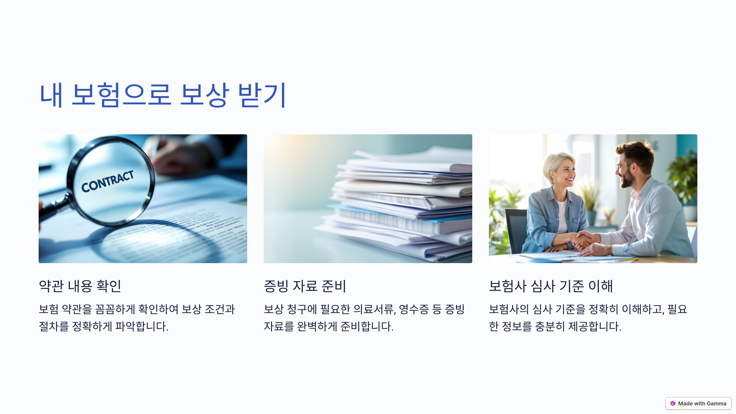 - 서류가 부족하거나 모호하면 보상이 지연되거나 거절될 수 있습니다.