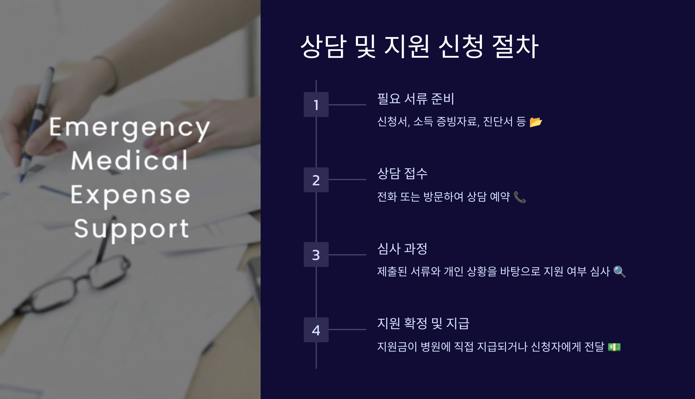 긴급 의료비 지원을 받으려면 다음 절차를 따라야 합니다: