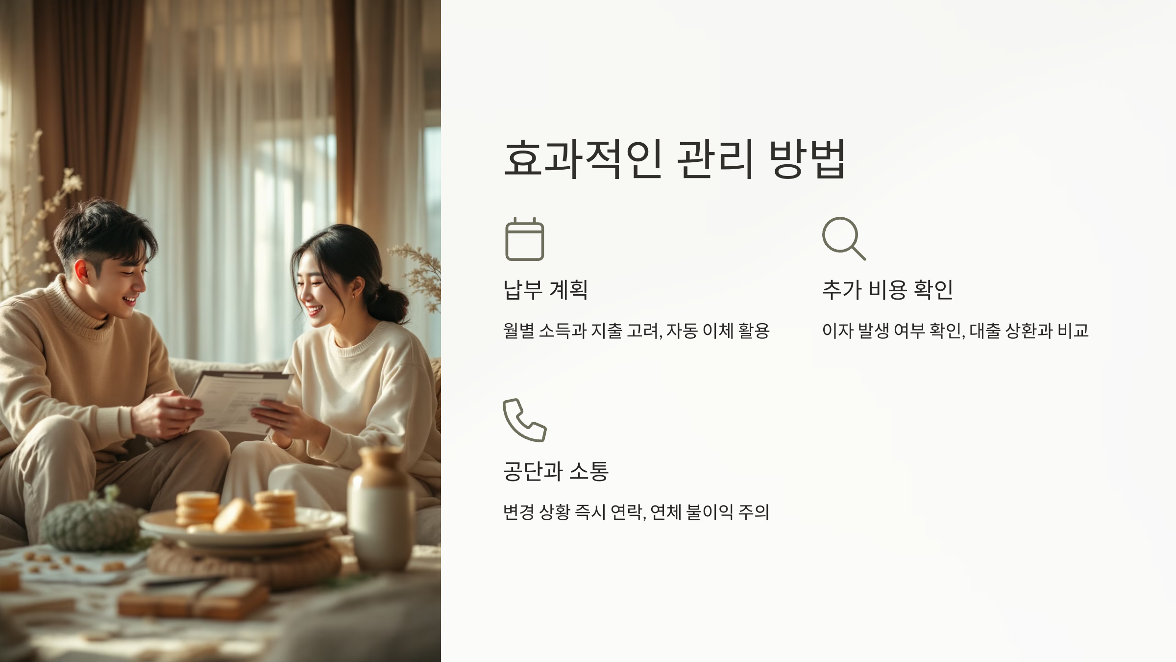 - 월별 소득과 지출을 고려해 납부 일정을 설정하세요.