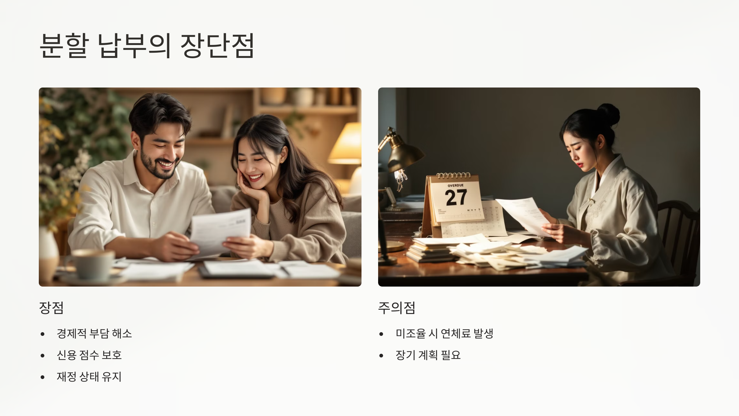 - 분할 납부를 선택한 이유가 긴급 상황이라면, 예산을 더 꼼꼼히 관리해야 합니다.