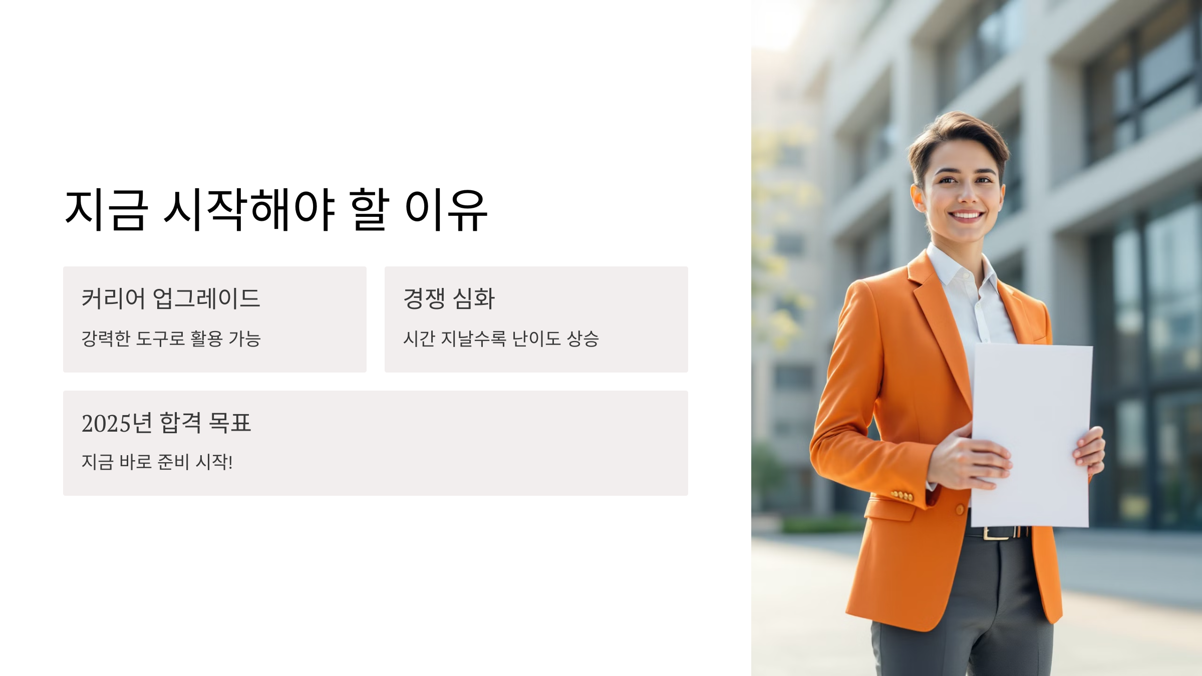 손해사정사 자격증은 단순한 자격증이 아니라, 여러분의 커리어를 한 단계 업그레이드할 강력한 도구입니다. 시간이 지날수록 경쟁은 치열해지고 시험 난이도도 높아질 것입니다. 2025년 합격을 목표로 지금 바로 준비를 시작하세요!