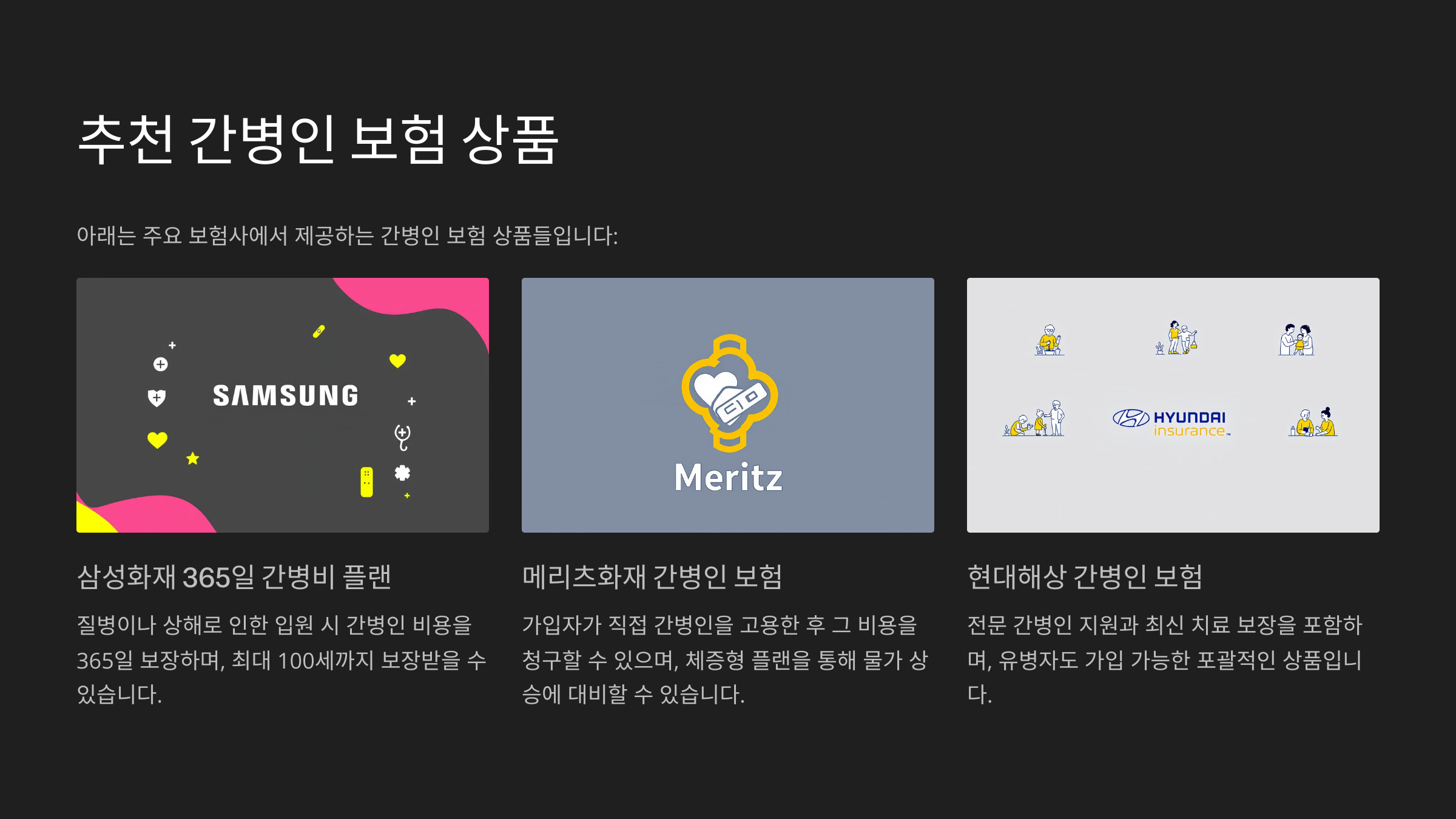 - 간병인 지원 보장: 입원 치료 중 간병인이 필요할 경우, 보험사에서 간병인을 직접 파견하거나 간병 서비스 비용을 지원합니다.