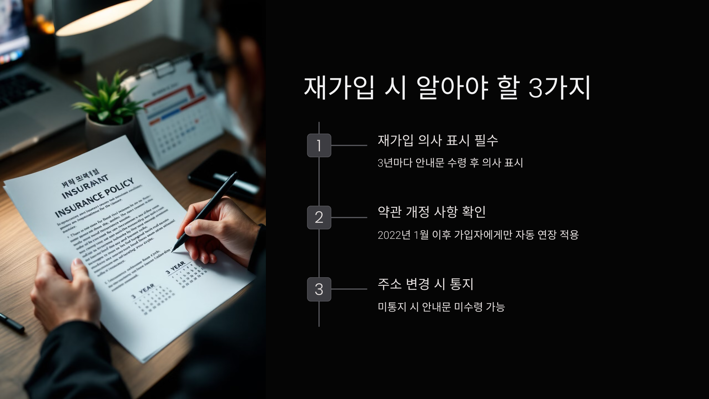 - 보험사의 등기우편을 반드시 확인하고, 재가입 의사를 명확히 표시하세요.