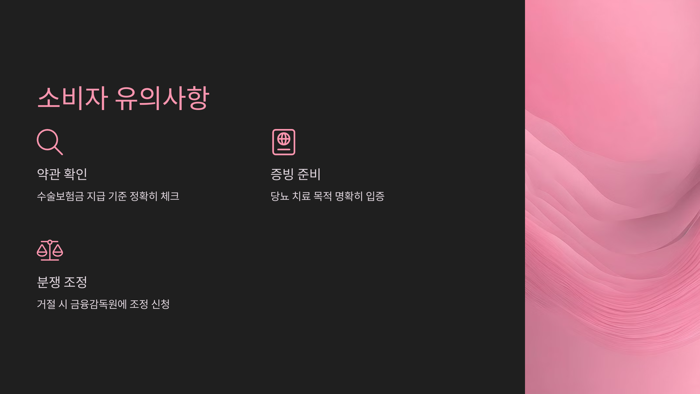 보험 가입 전 약관을 꼼꼼히 확인하고, 수술보험금 청구 시 의학적 필요성을 명확히 입증하는 것이 가장 중요합니다.
