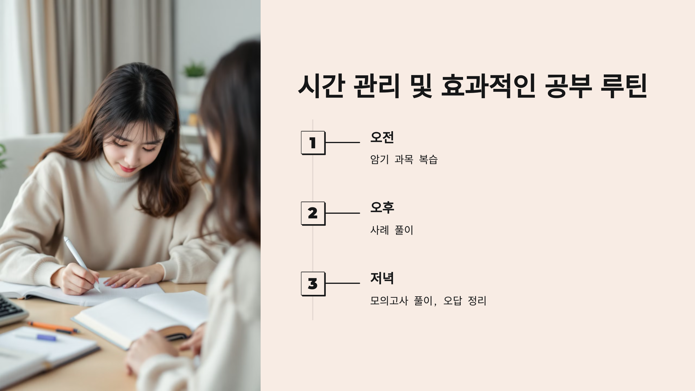 중요한 것은기출 문제 풀이와오답 분석을 철저히 하는 것이에요. 또한, 하루하루 계획적으로 학습하며 모의고사를 적극 활용하는 것이 합격의 지름길입니다!