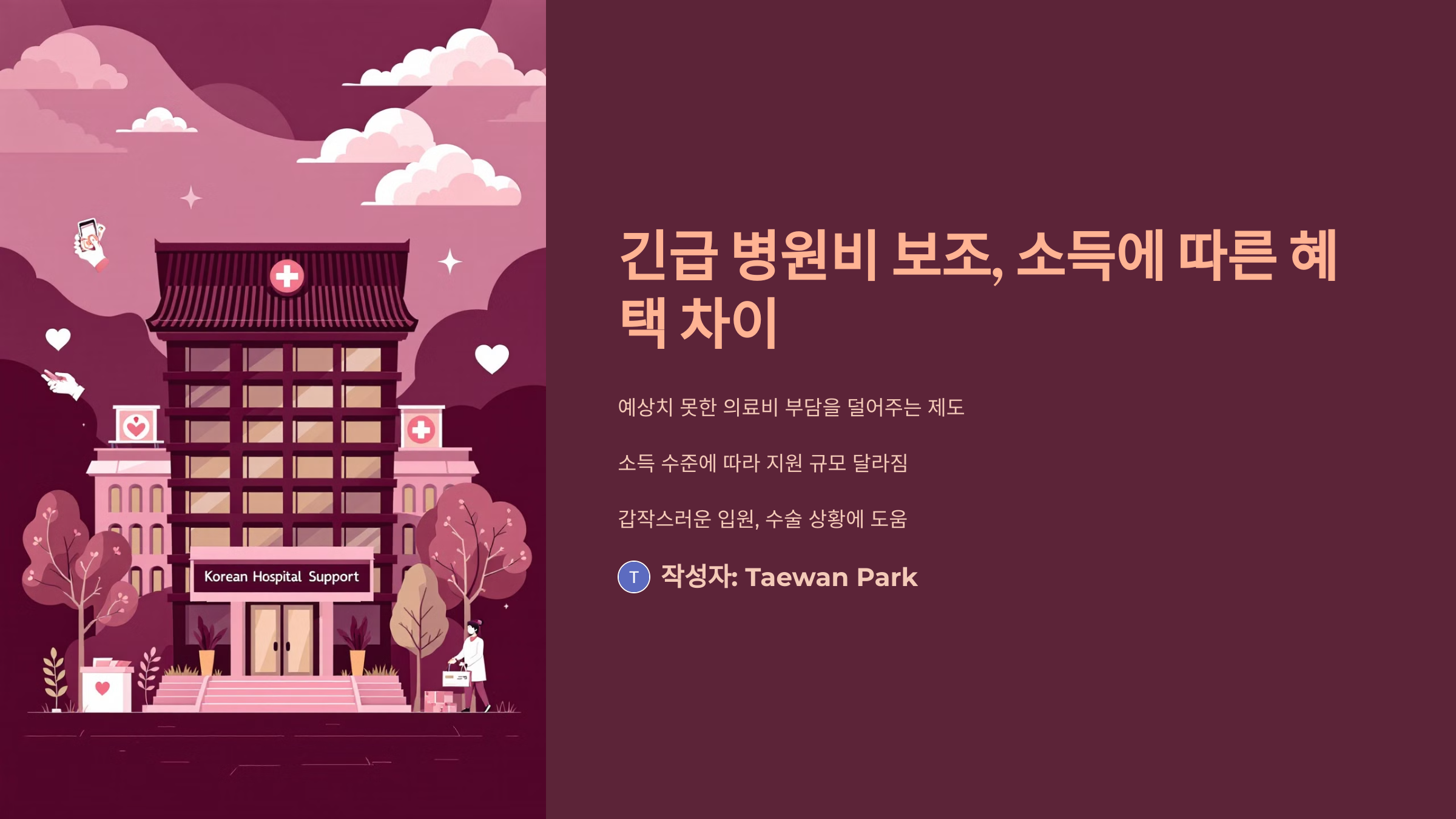 🏥 긴급 병원비 보조란?긴급 병원비 보조는 예상치 못한 의료비 부담을 덜어주는 제도로, 소득 수준에 따라 지원 규모가 달라집니다.이 제도는 갑작스러운 입원, 수술 등의 상황에서 경제적 어려움을 겪는 사람들에게 큰 도움을 줍니다.오늘은 소득에 따른 혜택 차이를 중심으로, 이 제도의 세부 사항을 알아보겠습니다!📌 소득에 따른 혜택 차이란?긴급 병원비 보조는 가구의 소득 수준과 재산 상태를 기준으로 지원 규모가 차등 적용됩니다.기준 중위소득을 중심으로 소득 구간이 나뉘며, 구간별 혜택은 아래와 같습니다:1. 중위소득 50% 이하 가구혜택: 병원비의 최대 90% 지원특징: 가장 높은 비율의 지원을 받을 수 있으며, 본인 부담금이 최소화됩니다.2. 중위소득 50~75% 가구혜택: 병원비의 70~80% 지원특징..